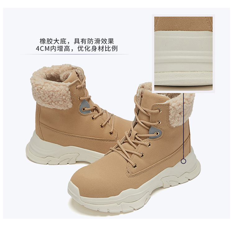 Ladies' stitching cute mid-cut boots and velvet warm and comfortable sneakers in autumn and winter.JIAN ER Shoes Company's new winter product recommendation will bring you different warmth in the cold winter.The upper is made of synthetic leather and lamb wool stitching, Smooth hand feeling, not easy to deform, outdoor travel is not afraid of the cold,which is fashionable and cute.The ankle support is high-top, the gentle ankle support is anti-crimping, and the cold wind is poured in, and the eversion fluff is more fashionable. Add velvet inside to improve warmth retention,Thick design, deep heat gathering. The plush lining softly wraps your feet for comfort and warmth against the severe cold in winter. The rubber outsole has a non-slip effect. Compared with ordinary short boots, sports shoes are lighter and more comfortable to wear. Increase the height within 4 cm, optimize the proportion of the body.The outsole is shock-absorbing and resilient, anti-skid and wear-resistant, with three-dimensional anti-skid patterns to walk every step steadily, making travel more secure.The stiff and stylish shoe design makes your outfit attractive, and calmly cope with every occasion, with excellent texture and soft fit.A pair of comfortable and versatile shoes will increase work efficiency.